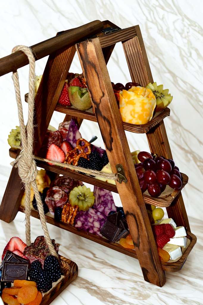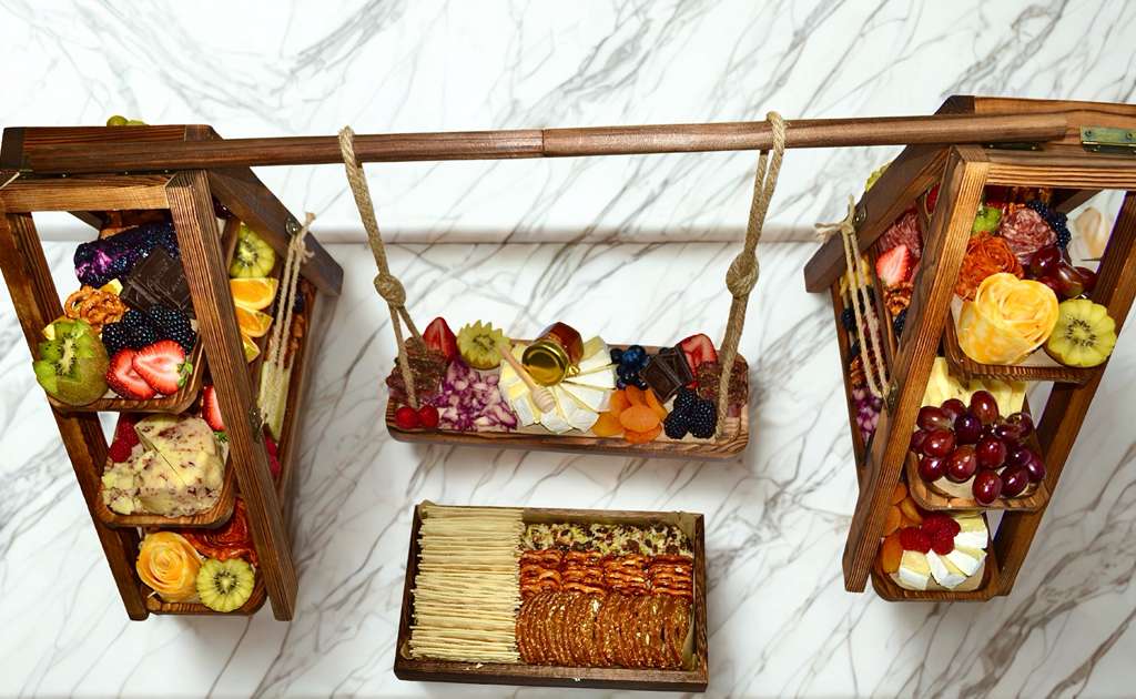 Includes:• 9 deluxe cheeses• 6 premium charcuterie selections• fresh seasonal fruit• dips• dried fruits• nuts• olives• pickles• artisan crisps• pretzels• artisan crackers• honey and jam• chocolates